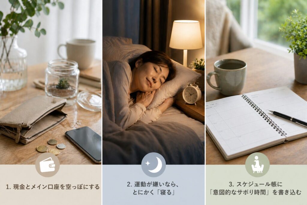 まずは今日、お財布の現金を減らしてみるか、寝る前の1時間を「何もしない時間」に設定してみてください。